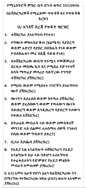 በሚኒስትሮች ምክር ቤት የትራፊክ ህግ ጥሰት ለመቆጣጠር የጸደቀ ደንብ ቁጥር 557/2016